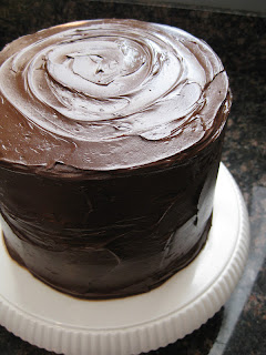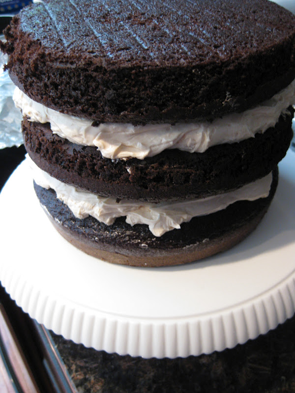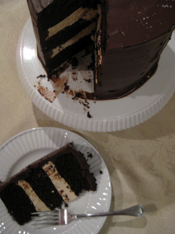 I love any excuse to bake a delicious chocolatey cake and what better reason than to celebrate two birthdays! We celebrated my brother and sister-in law's birthdays over Easter weekend so I decided to attempt a new cake. I saw this cake a few months back on Pinterest and was waiting for the perfect time to give it a try. It worked out great because I was able to make the cake layers Thursday night and assemble and frost the cake Friday morning before the family came to town. It kept really well in the fridge until Saturday night when we finally got to dig in. If you are like me, you probably only make celebration cakes at busy times, such as when your entire family is in town for a weekend, or you are traveling a distance to be at a special event. Hence, I believe it's important to find recipes that can be made ahead of time to help maintain your sanity. This decadent cake fits the bill!